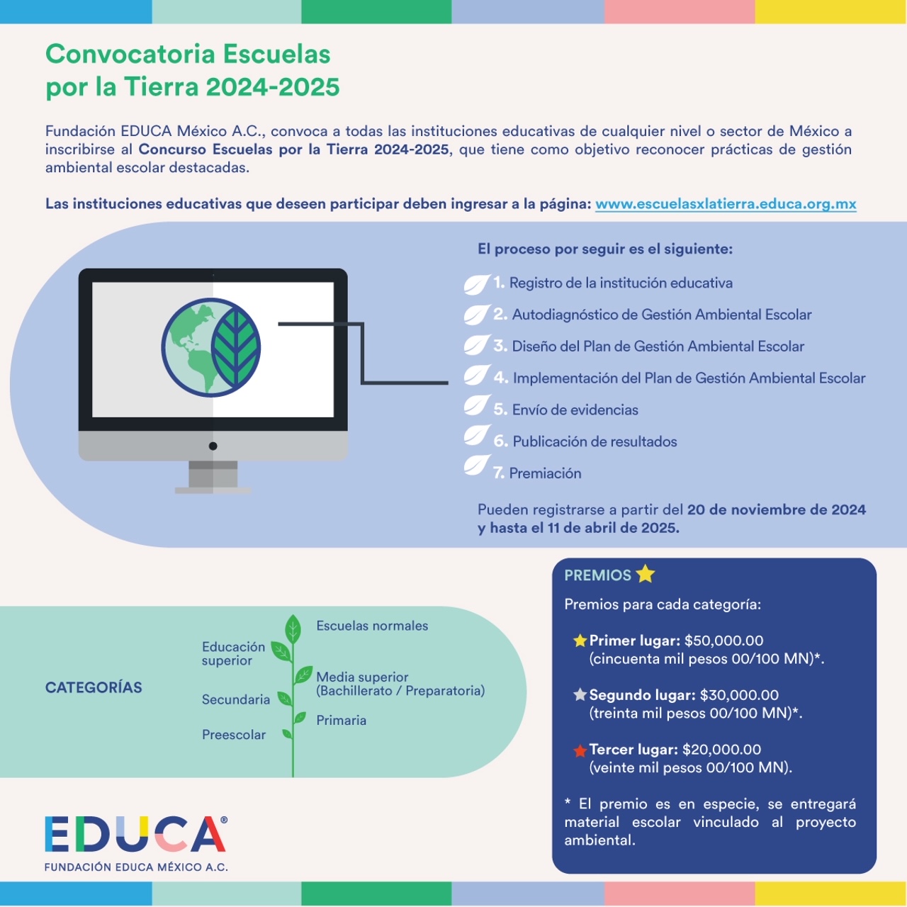 Fundación EDUCA México A.C., convoca a todas las instituciones educativas de cualquier nivel o sector de México a inscribirse al Concurso Escuelas por la Tierra 2024-2025, que tiene como objetivo reconocer prácticas de gestión ambiental escolar destacadas.