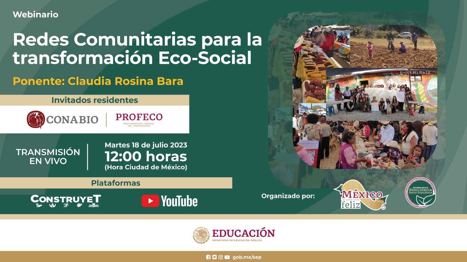A toda la comunidad escolar los invitamos al Webinar del Programa de Educación Ambiental y Desarrollo Sostenible de la SEMS: "Redes Comunitarias para la transformación Eco-Social”, dirigido a los jóvenes y docentes de Educación Media Superior, el cual se llevará a cabo el día martes 18 julio de 2023 a las 12:00 horas, de forma virtual a través de la liga: