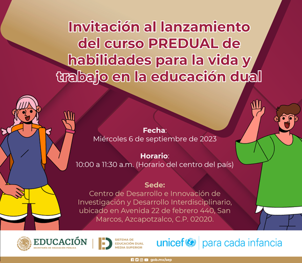 Derivado de las políticas públicas de la Subrecretaría de Educación Media Superior, referente al eje 2 sobre la Educación Dual, les compartimos la invitación para asistir al evento del "Lanzamiento del Curso Predual de Habilidades para la Vida y el Trabajo en la Educación Dual" que se llevará a cabo el día 06 de septiembre del presente de 10:00 a 11:30 hora centro,en la siguiente liga: