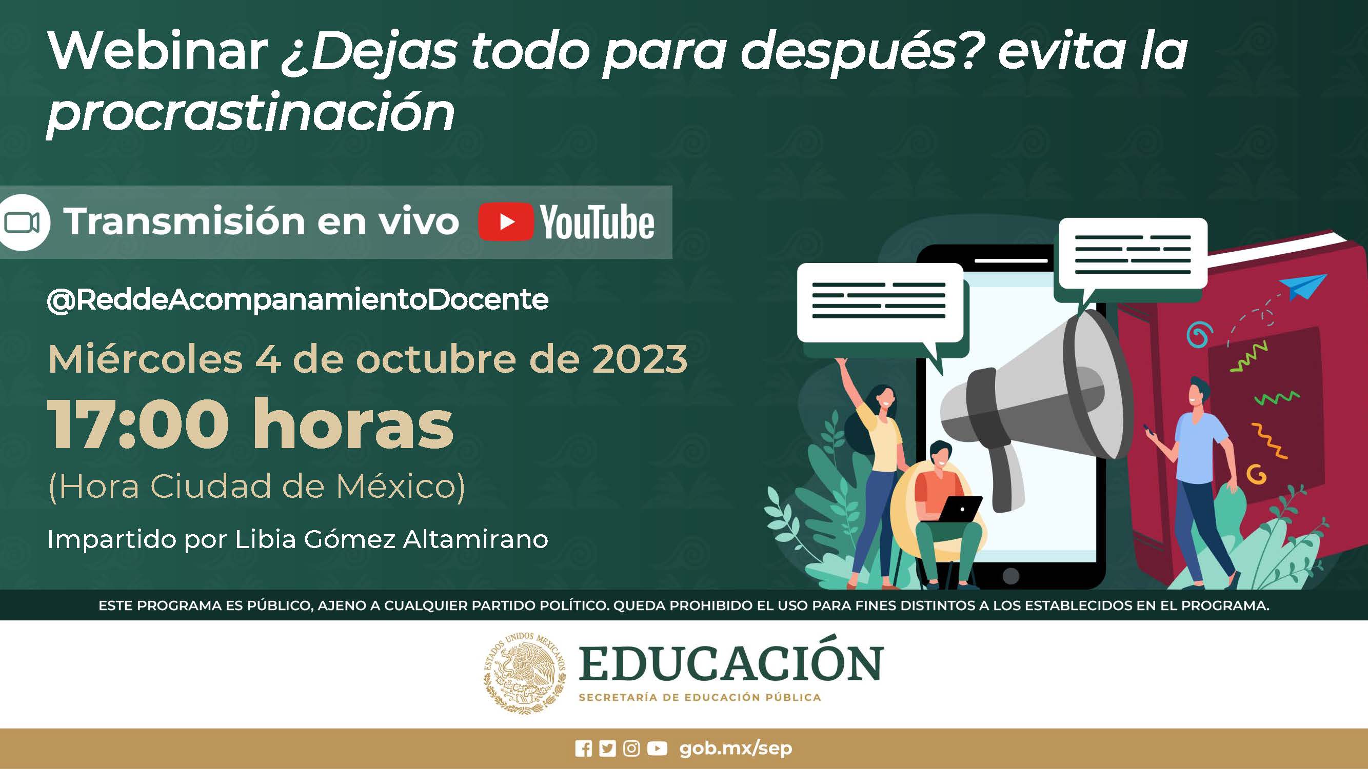 La Coordinación Sectorial de Fortalecimiento Académico (COSFAC) de la Subsecretaría de Educación Media Superior (SEMS) les hace la atenta invitación para los estudiantes al Webinar: ¿Dejas todo para después? evita la procrastinación, impartido por la Dra. Libia Gómez Altamirano, en el marco de los Recursos socioemocionales del MCCEMS.