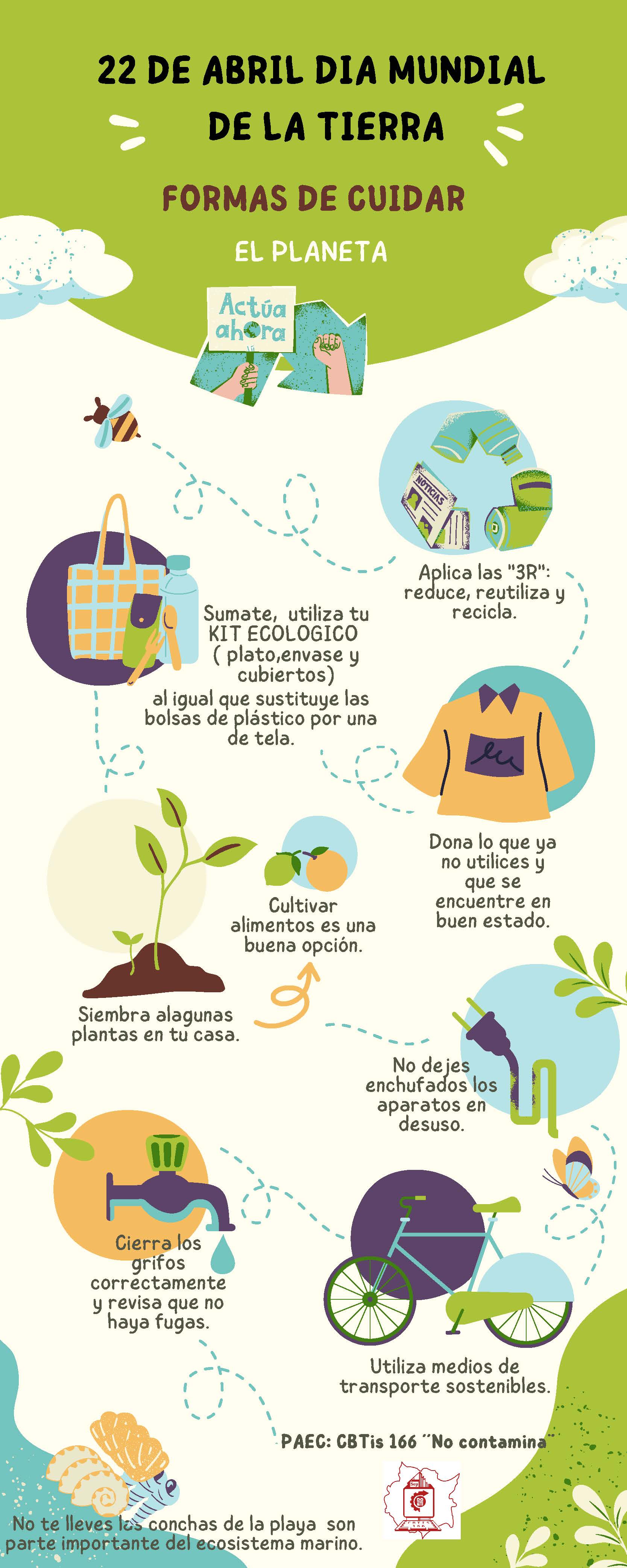 Sumémonos a esta celebración con acciones que mejoren las condiciones de nuestro planeta, como: cambiar las lámparas incandescentes a focos ahorradores, promover la reforestación, promover el reciclaje, y fomentar el uso de la bicicleta y transporte público. Las pequeñas acciones son las que dan pie a los grandes cambios.
