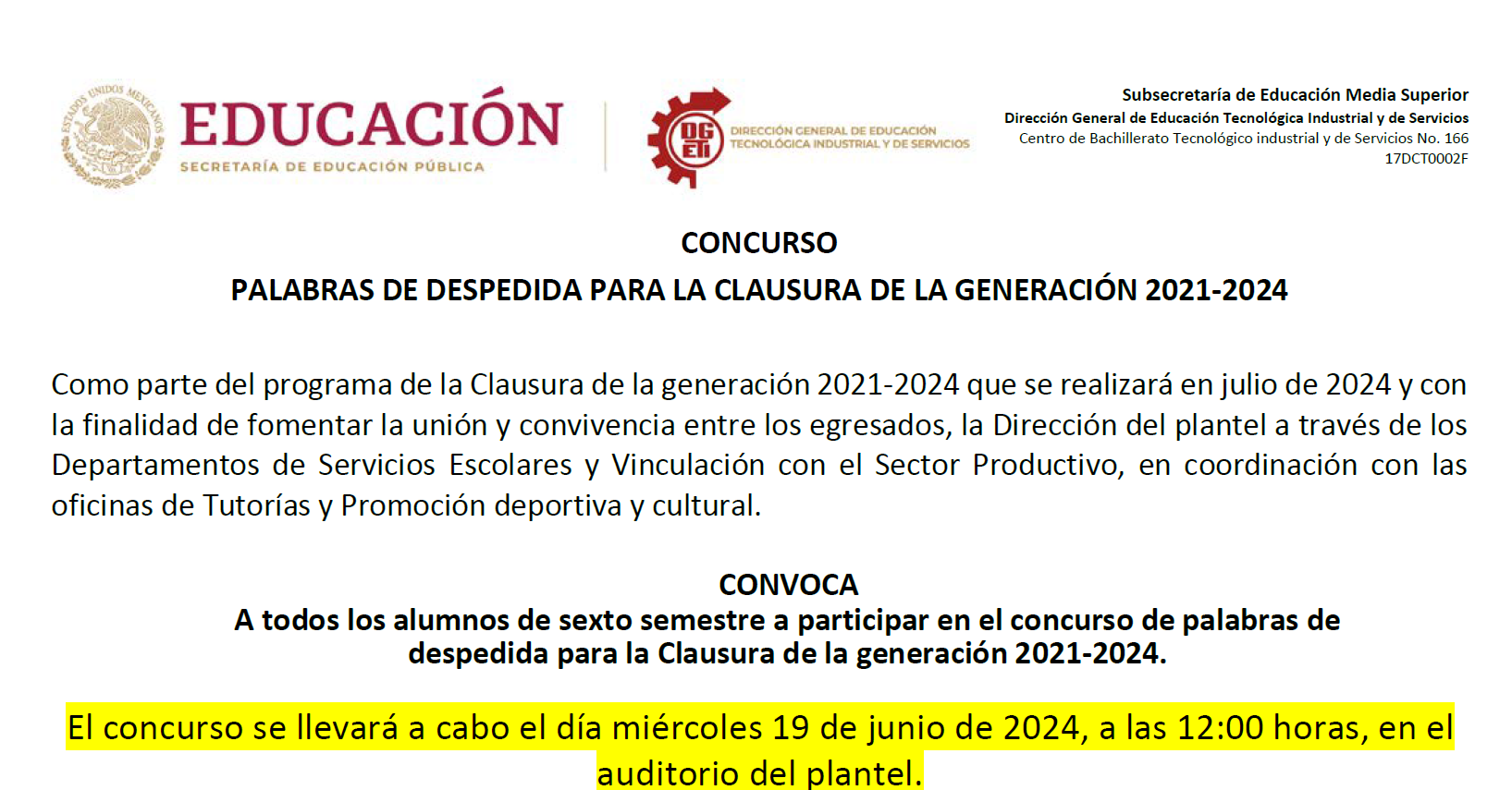CONCURSO: Los candidatos deberán presentarse el día miércoles 19 de junio de 2024 a las 12:00 hrs, en el auditorio del plantel para presentar su discurso. Los aspectos que evaluará el jurado son: